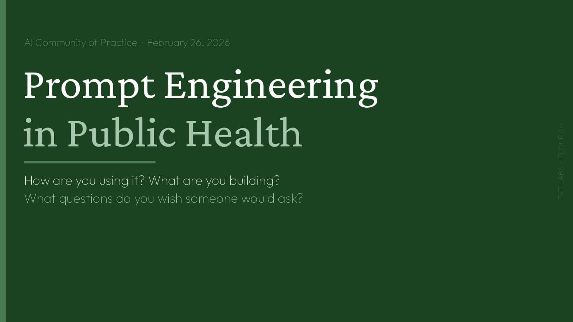 F&T Labs leads AI implementation for governmental public health. We provide AI training for public health professionals, AI policy development for health departments, conference speaking on AI in public health, and practical guidance on responsible AI adoption. From practitioners who've managed epidemiology programs, built public health data systems, and led health department operations—woman-owned, 8(a) certified.