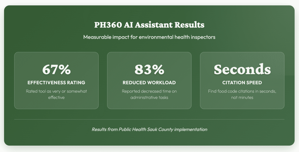 Public Health Sauk County inspectors report that the PH360 AI assistant transforms three recurring tasks while delivering measurable results: